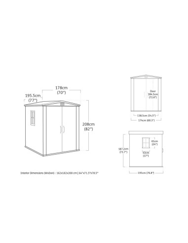 Dimensioni esterne assemblate: 195,5 x 178 x 208 cm (L x P x A); dimensioni interne: 182 x 162 x 200 cm (L x P x A)