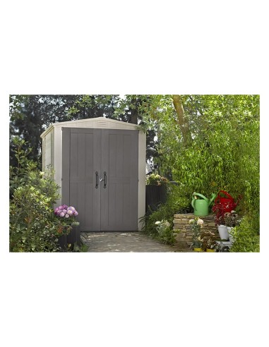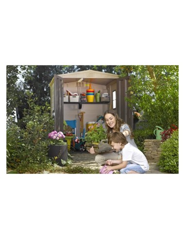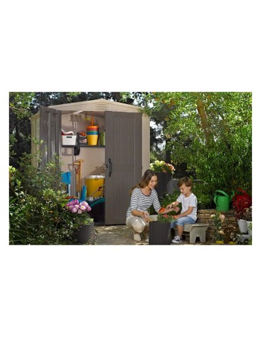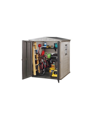 La versione 6 x 6 include due ripiani con staffe, e un pavimento rinforzato che protegge da pioggia e parassiti indesiderati. La casetta è progettata per essere chiusa con un normale lucchetto (non incluso), per offrire maggiore sicurezza. Realizzata in resina resistente alle intemperie e rinforzata con acciaio, la Factor 6 x 6 è praticamente esente da manutenzione e non scolorisce. Basta una semplice lavata di tanto in tanto per mantenerla come nuova. La casetta è pensata per un montaggio fai-da-te e richiede solo una conoscenza di base del bricolage.