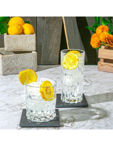 Con una capienza di 350 ml, un’altezza di 15 cm e un diametro di 7 cm, questi bicchieri sono perfetti da impugnare, eleganti ma comodi da utilizzare ogni giorno. Il design facettato non solo valorizza la bevanda all’interno ma arricchisce l’esperienza visiva del servizio, rendendo anche i brindisi più semplici un momento scenografico.