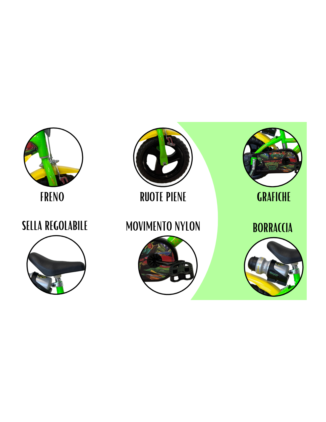 La bicicletta Dino Bikes Tartarughe Ninja 12" è perfetta per i piccoli fan dei celebri supereroi. Dotata di telaio in acciaio resistente, monovelocità, paracatena e parafanghi anteriori e posteriori, garantisce sicurezza e durata. Le gomme in EVA e il freno anteriore offrono stabilità e controllo, mentre lo scudo anteriore e il portaborraccia posteriore con borraccia completano il design divertente e funzionale. Inclusi stabilizzatori per una guida sicura. Ideale per bambini dai 3 ai 5 anni, altezza consigliata 92-104 cm.