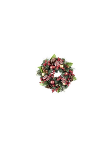 Corona Natale 45cm con Pigne, Sfere, Bacche Rosse e Nastro Scozzese Flora