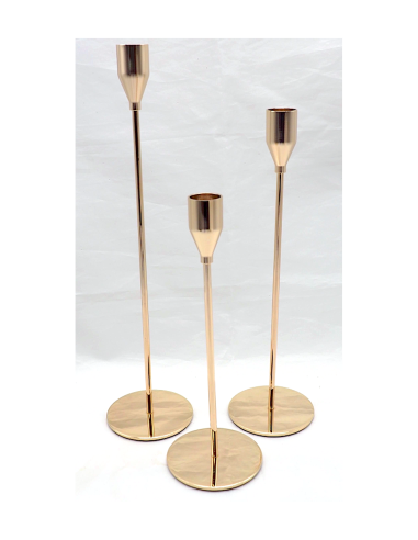 Realizzati in metallo dorato con finitura brillante, si adattano perfettamente a qualsiasi stile d’arredo, dal classico al moderno. Le tre altezze differenti (22, 27 e 32cm) creano un armonioso gioco di volumi e luci, rendendo ogni ambiente più accogliente e festoso.