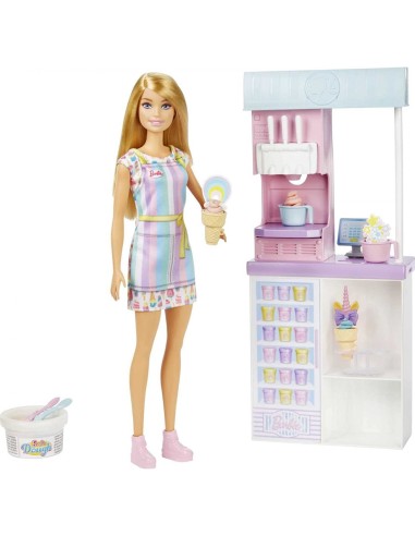 - Include la gelateria, una bambola Barbie® (alta 30,4 cm) e accessori da gelateria: pasta modellabile in 2 colori, 2 coppette, 2 coni, 3 topper, 2 cucchiaini, un porta-coni e un registratore di cassa.