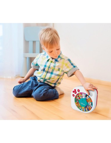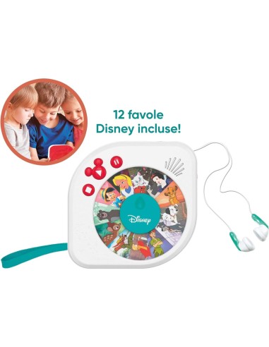 Il dispositivo contiene 12 storie audio tratte dai più amati film d’animazione Disney, tra cui Il Re Leone, Biancaneve, Pinocchio, Gli Aristogatti, Peter Pan e molti altri.
