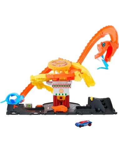 Difendi la pizzeria di Hot Wheels City dall’enorme cobra nel playset Attacco del Cobra in Pizzeria! Rilasciando la coda del cobra, i bambini lanciano la loro macchinina su uno dei tre percorsi casuali, ricchi di sorprese e avventure. Questo set fa parte della serie Netflix 'Let's Race' e permette di rivivere le scene più emozionanti o inventarne di nuove con la propria fantasia. La pista porta le macchinine alle fauci del cobra, a un cassonetto o a sconfiggere il cobra con una pizza in faccia. Collegabile ad altri set Hot Wheels e Matchbox per creare sfide sempre nuove. Include 1 macchinina Hot Wheels in scala 1:64.