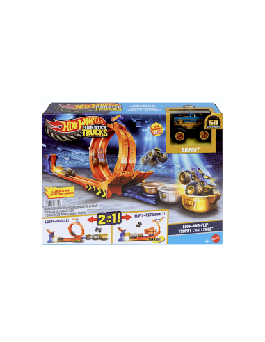Divertiti con acrobazie e lanci spettacolari grazie al playset Hot Wheels Monster Trucks Sfida Trofeo Gira e Capovolgi! Include un truck Bigfoot die-cast in scala 1:64 con decorazioni esclusive per il 50° anniversario. Il playset offre due modalità di gioco: lancia Bigfoot nel loop per totalizzare punti o rimuovi metà del loop per eseguire una capriola all’indietro e atterrare nei trofei. Puoi anche usare qualsiasi altro truck Hot Wheels Monster Trucks in scala 1:64 (venduti separatamente) per sfidare amici e collezionisti in emozionanti acrobazie.