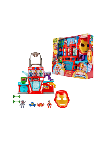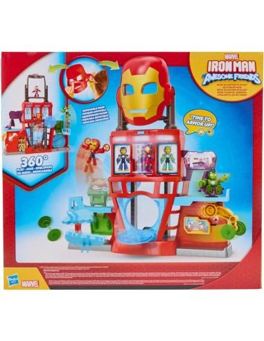 Il playset elettronico Iron Quarters di Hasbro, tratto dalla linea "Marvel Iron Man and His Awesome Friends", è un vero campo d’azione per i giovani fan del supereroe. Questo set include una figura posabile di Iron Man e una di Ultron, ciascuna alta circa 7,6 cm, oltre a cinque accessori tra cui tra elmetti, bilancieri e una lancia di Ultron.