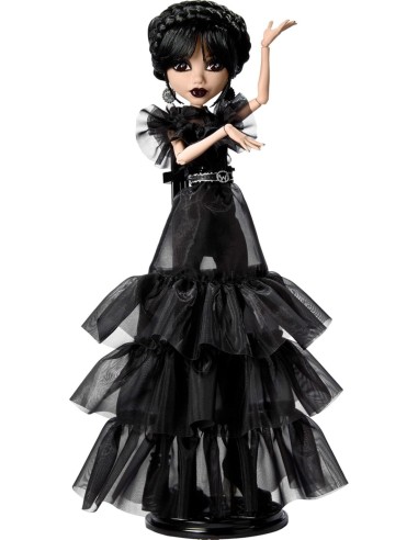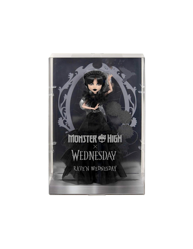 Direttamente dall’universo dark di Monster High arriva la sofisticata ed elegante Mercoledì Rave'N, una bambola da collezione ispirata alla celebre scena del ballo della serie Mercoledì. Vestita con un raffinato abito nero gotico, è una riproduzione fedele del personaggio, pensata per fan e collezionisti attenti ai dettagli.