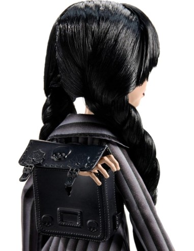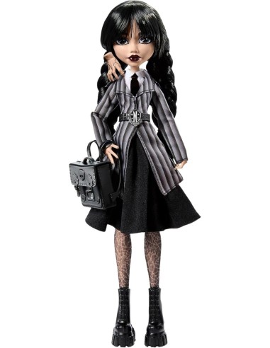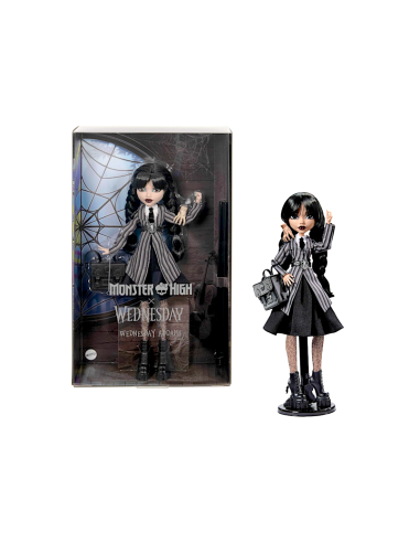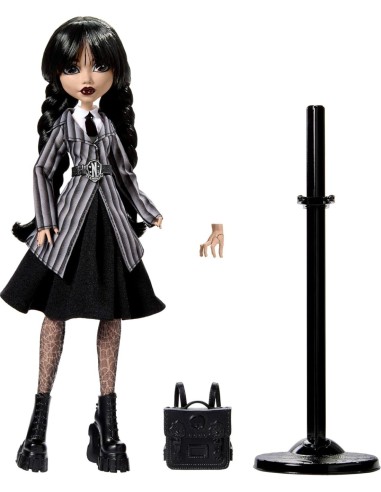 La bambola Monster High x Wednesday Addams unisce il fascino oscuro del personaggio cult con il tocco spettrale del mondo Monster High. Vestita con la divisa “Nevermore Academy”, la bambola indossa una cravatta, cintura statement e calze con motivo ragnatela, riprendendo elementi iconici della serie. Viene accompagnata da Thing, la mano vivente, insieme ad accessori come uno zainetto tematico e stivali decorati.
