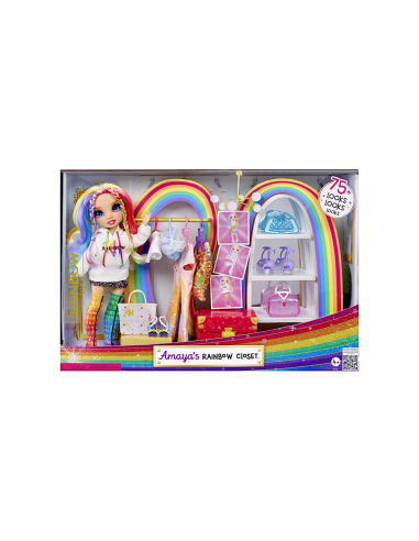 Questo set esclusivo include la bambola Amaya Raine, con i suoi lunghi capelli arcobaleno, occhi scintillanti e uno stile unico, insieme a un grande armadio fashion pieno di abiti, scarpe e accessori colorati.