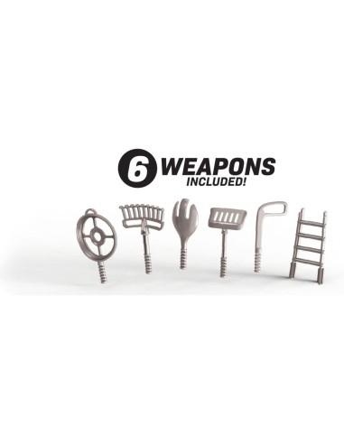- Accessori da Combattimento: Viene fornito con 6 armi e strumenti diversi per intensificare il divertimento e personalizzare ogni battaglia.