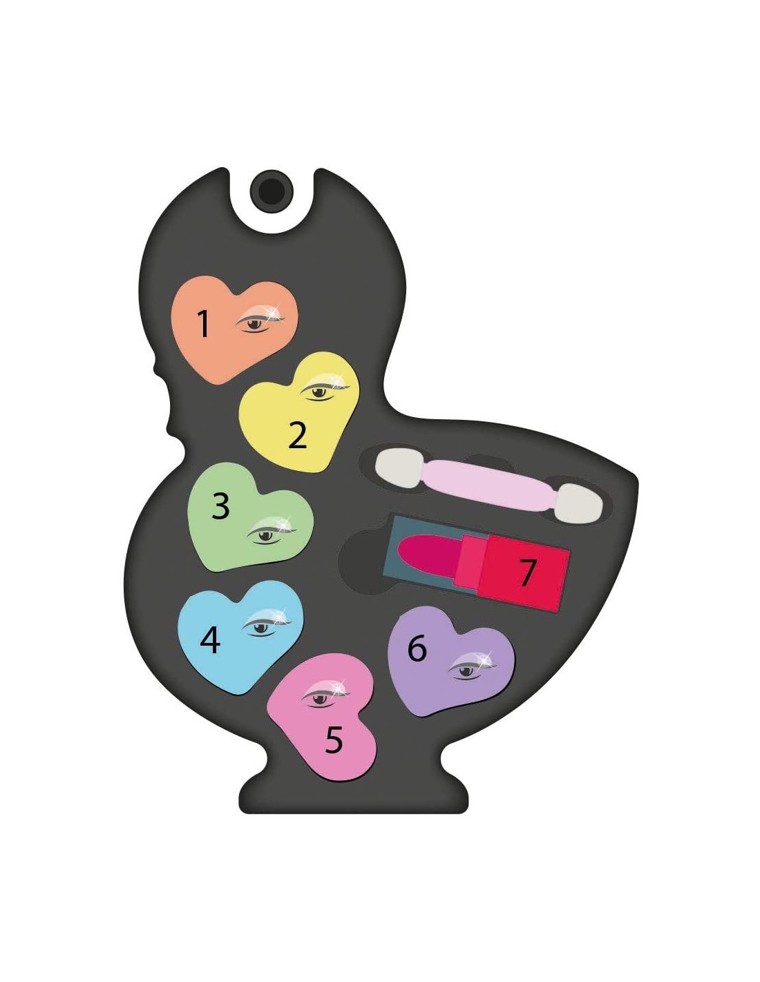 Il cofanetto, a forma di cigno elegante e brillante, racchiude una selezione di cosmetici sicuri: 6 ombretti dai toni delicati, 1 rossetto e un applicatore, perfetti per creare look allegri e fantasiosi.