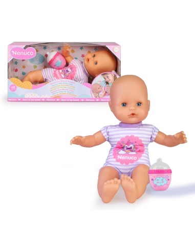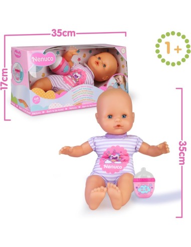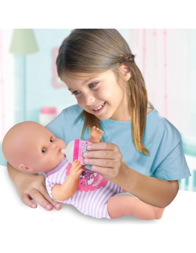 Nenuco bambola morbida con biberon, pigiama a righe, sonaglio, alta 35 cm, biberon rosa e bianco, per bambini dai 10 mesi