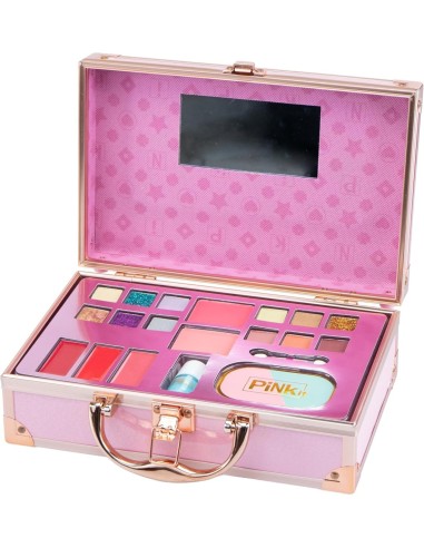 La PINKIT Make Up Travel Case è una raffinata valigetta porta trucchi dal design glamour, impreziosita da eleganti rifiniture dorate. All’interno contiene un set completo di make up pensato per bambine: ombretti, fard, lucidalabbra e accessori utili per creare look sempre diversi. I prodotti sono realizzati con formule sicure, testate, senza parabeni e facilmente rimovibili con acqua e detergente delicato. Lo specchio integrato nel coperchio e lo scomparto interno permettono di mantenere tutto in ordine. Compatta e dotata di maniglia, è perfetta da portare sempre con sé.