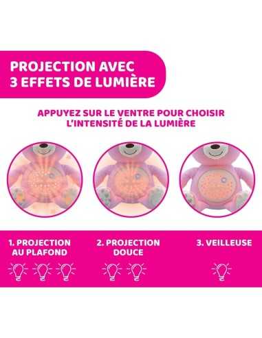 Effetti Luminosi: Dotato di 3 effetti luminosi, l’orsacchiotto proietta una luce notturna magica, una proiezione soft e una luce notte, creando atmosfere rassicuranti per il bambino.