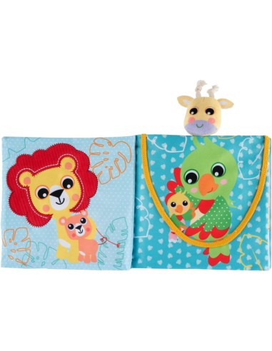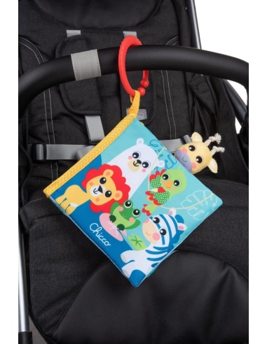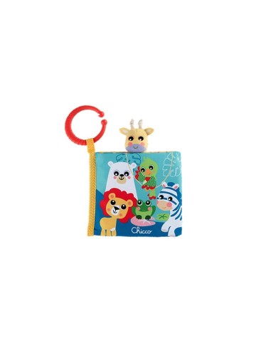 Il Chicco Libretto degli Animali è un libro sensoriale per bambini realizzato in tessuto morbido, con diverse superfici tattili e rumori di scricchiolio per stimolare i sensi. Include pagine illustrate sugli animali e una giraffa marionetta da dito per raccontare storie. Facile da agganciare a passeggini e seggiolini con la clip di plastica, e comodamente lavabile in lavatrice.