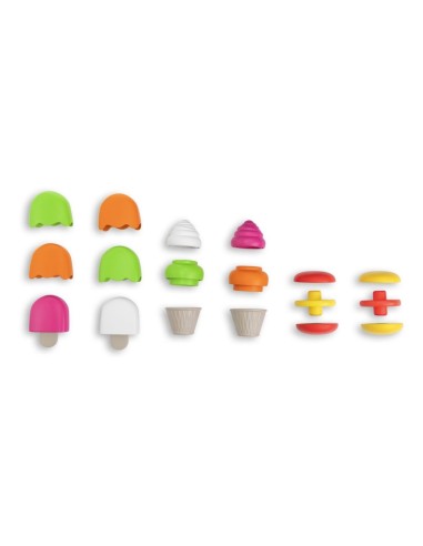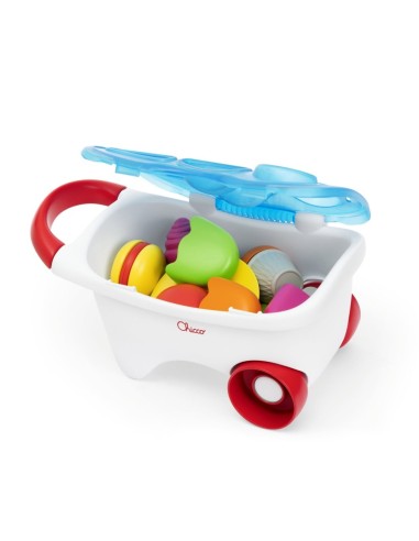 Include 19 pezzi: coni, gusti di gelato, ghiaccioli, biscotti per macaron e accessori, tutto riponibile comodamente all'interno del carretto grazie al coperchio trasparente. Dotato di ruote libere e una pratica maniglia, è facile da trasportare ovunque, anche dai più piccoli.