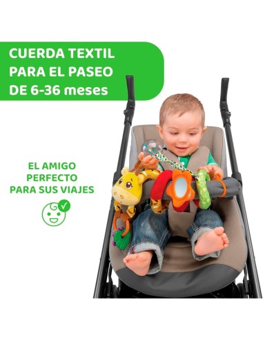 Gioco Passeggino Interattivo: La Fune Passeggio Mrs Giraffa di Chicco è un gioco multifunzionale che si aggancia facilmente alla barra del passeggino, offrendo intrattenimento durante le passeggiate e in casa.