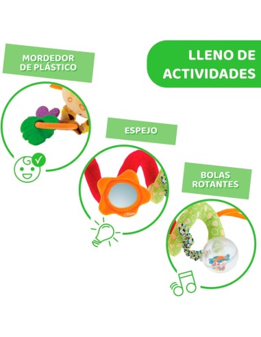 La Chicco Fune Passeggio Mrs Giraffa è una spirale giocattolo colorata e interattiva progettata per intrattenere il bambino durante le passeggiate e a casa. Realizzata in tessuto morbido e plastica, offre una varietà di stimoli sensoriali con uno specchietto riflettente, un anello con pendenti per dentizione e una pallina con sonaglio. Facile da agganciare grazie ai laccetti in tessuto e lavabile per garantire massima igiene, è ideale per bambini dai 6 mesi ai 3 anni. Un'aggiunta divertente e pratica per ogni passeggino.