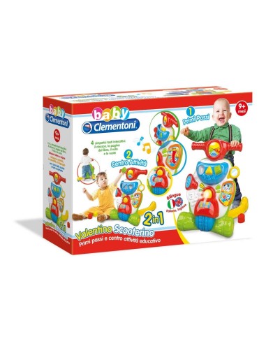 Il Valentino Scooterino Primi Passi Clementoni è un gioco 2 in 1 che aiuta il bambino a sviluppare la motricità, il linguaggio e l'immaginazione. A forma di scooter, il gioco è anche un centro attività interattivo che insegna lettere e numeri in italiano e in inglese. Il cestino frontale dello scooter funge da incastraforme non elettronico, dove il bambino può inserire le 3 formine incluse. I 4 tasti interattivi (clacson, rullo, pagina del libro e ruote) stimolano la percezione visiva e uditiva, mentre la luce sotto al fanalino aggiunge un tocco di divertimento. Con suoni allegri e melodie, questo gioco bilingue è perfetto per bambini dai 9 mesi in su.