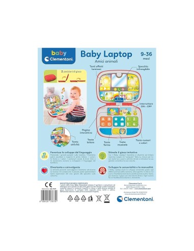 Il Laptop Amici Animali di Baby Clementoni è il giocattolo educativo perfetto per i bambini a partire dai 9 mesi. Questo laptop interattivo offre un'esperienza di gioco coinvolgente grazie ai suoi effetti luminosi, suoni realistici e uno specchio integrato che consente ai piccoli di vedersi mentre giocano. Con il design di un vero computer portatile, stimola l'immaginazione e la curiosità. Il laptop include 5 attività educative che permettono ai bambini di esplorare e imparare in modo divertente: possono simulare videochiamate con cuccioli, ascoltare musica, visualizzare immagini in galleria e utilizzare una calcolatrice semplice. Ogni pulsante attiva giochi di luce e suoni sullo schermo, rendendo l'interazione ancora più interessante. È leggero, solido e richiudibile, perfetto per essere portato ovunque. Progettato e sviluppato in Italia, è un giocattolo parlante consigliato per favorire lo sviluppo cognitivo e sensoriale dei bambini.