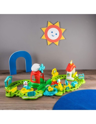 Il trenino, attivabile con il semplice tocco della ciminiera, inizia il suo viaggio animato con una serie di amici: un cagnolino, una mucca, un coniglietto e un anatroccolo, tutti pronti a rendere il gioco ancora più coinvolgente. La locomotiva parlante è progettata per interagire con diverse aree del play set, attivando effetti sonori divertenti, canzoni allegre e animazioni vivaci come il canto del gallo e il movimento dell'anatroccolo nello stagno.