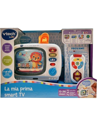La VTech La Mia Prima Smart TV è una televisione educativa e interattiva pensata appositamente per i bambini dai 12 ai 36 mesi. Dotata di telecomando interattivo incluso, offre 10 canali diversi, di cui 5 bilingue in italiano e inglese, per introdurre i piccoli all’apprendimento linguistico in maniera giocosa.