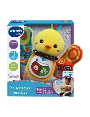 VTech Pio Sonaglino Interattivo è il sonaglio perfetto per accompagnare i neonati dai 3 ai 24 mesi nei momenti di gioco e scoperta. Grazie al pulsante luminoso e al sensore di movimento, il sonaglino si anima con 10 melodie e 3 canzoni in lingua italiana, stimolando udito, curiosità e sviluppo sensoriale. Morbido e sicuro, è facile da afferrare e offre al bambino ore di gioco educativo e divertente. Batterie incluse, pronto all’uso.