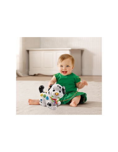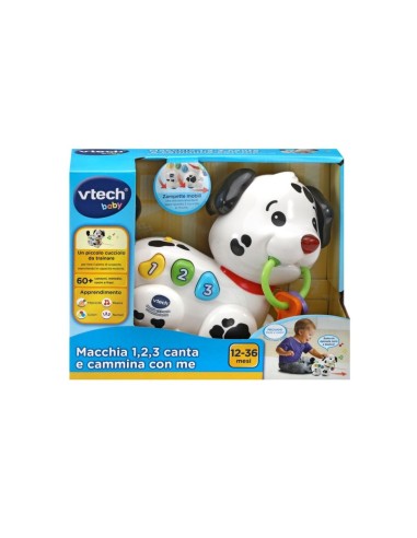 Baby Macchia Canta e Cammina è un cagnolino giocattolo interattivo che accompagna il bambino nelle sue passeggiate. Quando il bambino cammina con Macchia, le zampe del cane si muovono e il giocattolo emette suoni e frasi divertenti. Con 3 bottoni sul corpo, Macchia aiuta a scoprire numeri, colori, frasi e canzoni. Il nasino lampeggia a ritmo con le melodie, e il guinzaglio incluso permette di portare a spasso il cagnolino ovunque. Il giocattolo è ricco di suoni e melodie per un divertimento continuo.