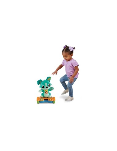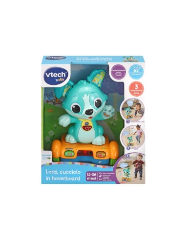 Baby Lord Cucciolo in Hoverboard è un giocattolo interattivo che combina il divertimento del gioco attivo con la tecnologia. Lord, un cagnolino dispettoso, invita il bambino a seguirlo mentre scappa su un hoverboard con tre ruote, muovendosi avanti, indietro e girando. Equipaggiato con quattro sensori, Lord evita gli ostacoli e sa quando il bambino si avvicina, scappando dalla parte opposta. Il giocattolo include quattro pulsanti interattivi per scoprire numeri, emozioni e musica, e offre 15 melodie e 3 canzoni per un intrattenimento continuo.