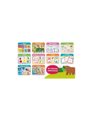 - Ampia Varietà di Giochi: Include 60 giochi diversi, come puzzle, tombola e memo, per stimolare le competenze di base dei bambini.