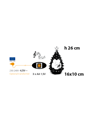 Il funzionamento avviene tramite 3 batterie AA (non incluse) con porta batterie integrato, ed è predisposto per l’alimentazione con trasformatore opzionale. Con certificazione IP20, è ideale per uso interno portatile. Con dimensioni 16x10xH26cm, è perfetto come decorazione da tavolo, mensola o come complemento per presepi e villaggi natalizi.