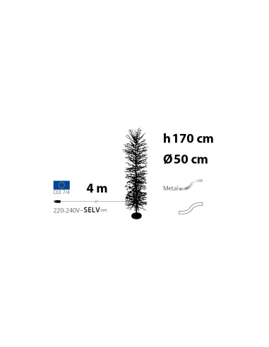 Con un’altezza di 170cm e un diametro di 50cm, questo albero slim è perfetto per chi ha poco spazio ma non vuole rinunciare a una decorazione scenografica. Il cavo bianco da 4m e il trasformatore SELV di sicurezza lo rendono adatto sia per ambienti interni che esterni.