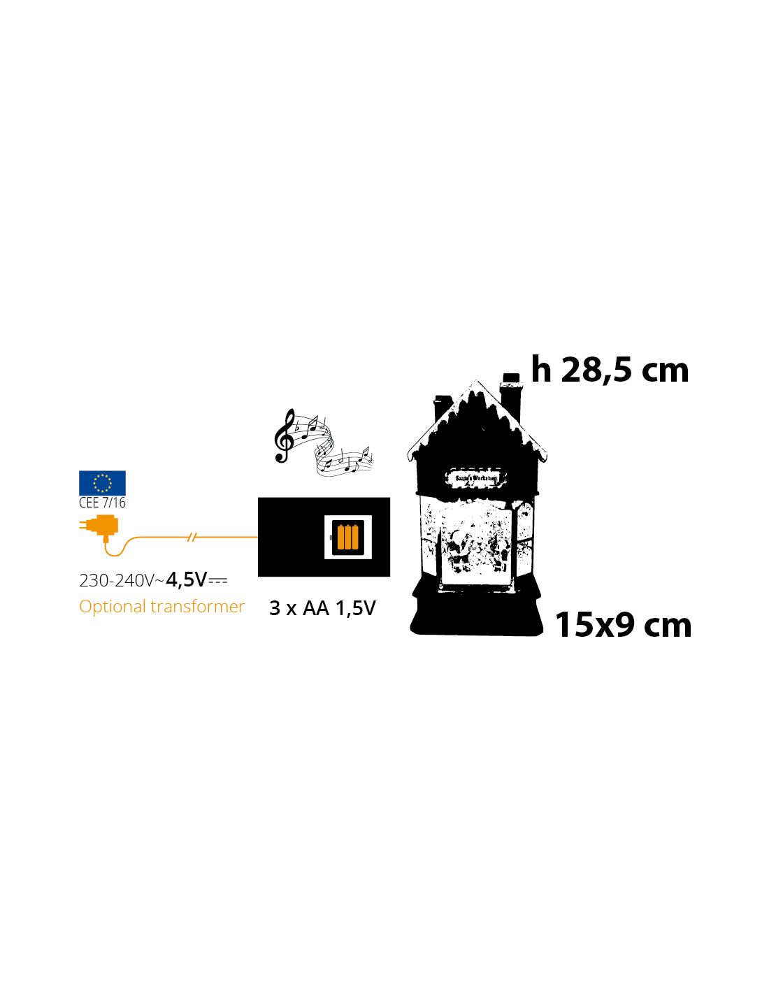 Funziona con 3 batterie AA (non incluse) e dispone di porta batterie integrato. Inoltre, è predisposto per alimentazione tramite trasformatore opzionale, garantendo massima flessibilità. Con dimensioni 15x9xH28,5cm e certificazione IP20, è ideale per uso interno portatile, perfetto come decorazione da tavolo, mensola o complemento per villaggi natalizi.