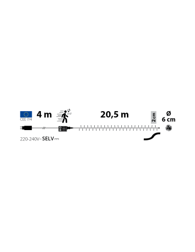Il cavo nero robusto da 20,5m (più 4m di cavo di alimentazione) garantisce praticità e versatilità, mentre il trasformatore SELV assicura massima sicurezza. Con certificazione IP44, è adatta sia per uso interno che esterno.