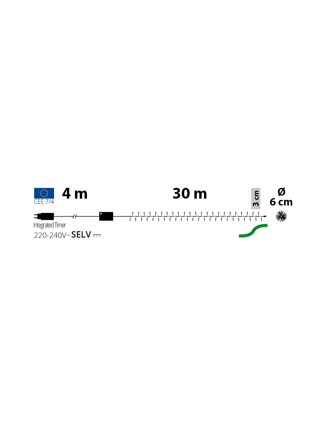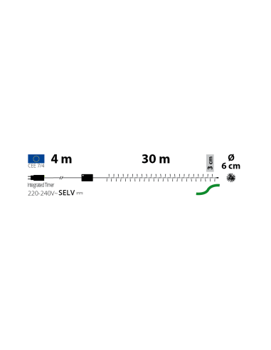 Il pratico Timer giornaliero (8 ore On / 16 ore Off) è facilmente gestibile tramite il pulsante luminoso a 3 funzioni (On-Timer-Off), integrato nel trasformatore SELV di sicurezza. Con una lunghezza totale di 30 metri + 4m di cavo di alimentazione, e classificazione IP44, è adatta sia per uso interno che esterno.