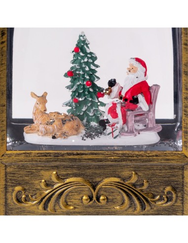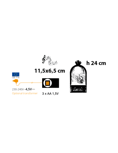All’interno, l’acqua in movimento arricchita da glitter riflette la luce dei LED Bianco Caldo, creando un suggestivo effetto scintillante che dona calore e magia. L’impianto musicale integrato riproduce 8 melodie natalizie in sequenza, attivabili tramite interruttore a 3 posizioni: Off – On1 (con musica) – On2 (senza musica).