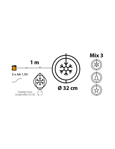Il sistema include un Timer giornaliero 8h On (16h Off), attivabile o disattivabile tramite pulsante a 3 funzioni (Timer – On – Off) integrato nel porta batterie IP44. Il funzionamento avviene con 3 batterie AA da 1,5V (non incluse), che rendono la decorazione portatile e facilmente collocabile ovunque.
