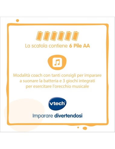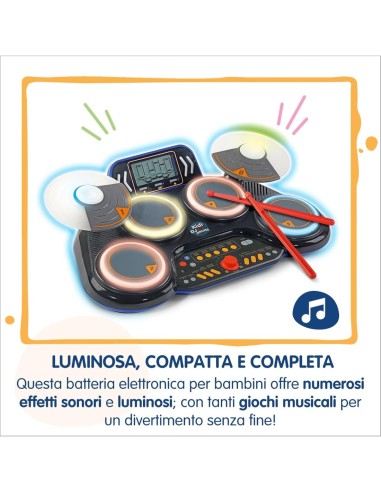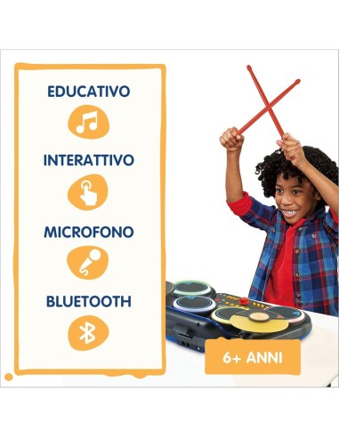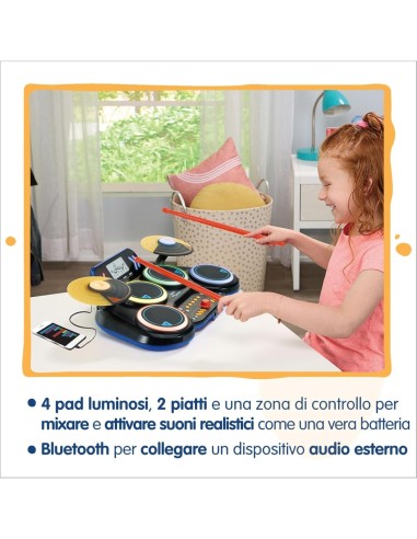VTech Kidi DJ Drums è la batteria elettronica pensata per bambini dai 6 anni in su. I pad luminosi e interattivi rendono il gioco divertente e stimolante, mentre le modalità musicali e il microfono integrato permettono di creare performance uniche. La modalità Bluetooth consente di collegare dispositivi esterni per suonare le proprie canzoni preferite. Bacchette incluse e completamente in lingua italiana, la batteria è pronta all’uso grazie alle batterie incluse. Perfetta per sviluppare senso del ritmo, coordinazione e creatività musicale.