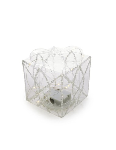pacco regalo in vetro con perline e luci 12x12x14 cm