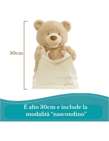 Gund Momo è un adorabile orsacchiotto interattivo alto circa 29–30 cm che gioca al cucù e recita sei frasi diverse. Quando il bambino preme la zampa sinistra, Momo si nasconde dietro la sua tenera copertina di raso per poi riapparire, muovendo musetto e zampette, regalando momenti di spensieratezza e meraviglia.