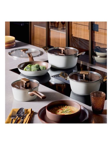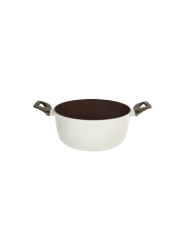 Il fondo ad alto spessore la rende compatibile con tutti i piani di cottura, inclusa l’induzione, mentre i manici antiscivolo e antiscottatura in materiali Bio Based assicurano una presa sicura. La finitura marrone interna e beige esterna dona un tocco elegante alla cucina.