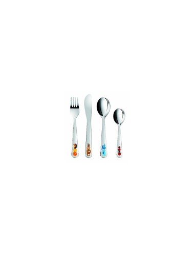 Set di posate per i bambini, composto da coltello, forchetta, cucchiaio e cucchiaino prodotti interamente in acciaio inox: per mangiare come i grandi! Il set da 4 pezzi è studiato appositamente peri bambini con un design ergonomico, dimensioni ridotte adatte alle loro manine e decorazioni divertenti.