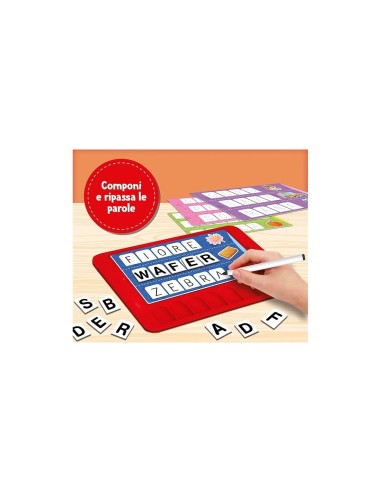 - Strumenti Inclusi: Il set include una base per scrittura e disegno, una basetta per comporre le parole, letterine, schede attività, una lavagna, un pennarello scrivi e cancella, e un cancellino.