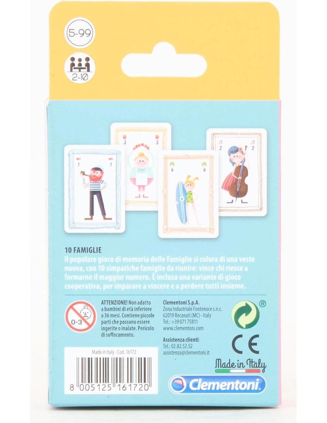 Il gioco di memoria **"10 Famiglie"** di Clementoni offre una versione rinnovata del classico gioco delle famiglie, pensato per bambini dai 5 anni in su. Con **40 carte illustrate**, i piccoli giocatori dovranno riunire le **10 simpatiche famiglie di animali**, ognuna composta da **2 genitori e 2 cuccioli**. Le famiglie sono rappresentate con caratteristiche uniche, come l'amore per lo sport, la montagna o la piscina. L’obiettivo è completare quante più famiglie possibile per vincere. Un gioco educativo che stimola la memoria e la capacità di osservazione, adatto a tutte le età, da **5 a 99 anni**. Divertiti e impara con le **colorate e dettagliate illustrazioni** delle famiglie animali!