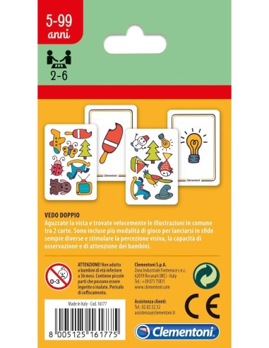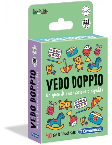 Il gioco Clementoni Sapientino Vedo Doppio è un'avvincente sfida di osservazione e rapidità per bambini e adulti. Con 40 carte ricche di dettagli, l'obiettivo è identificare rapidamente l'illustrazione che appare su due carte diverse. Ogni carta presenta due soggetti in comune con tutte le altre del mazzo, offrendo una varietà di 26 soggetti da abbinare e osservare. Il gioco è progettato per stimolare la percezione visiva, migliorare la capacità di attenzione e affinare le abilità di osservazione. Adatto a bambini dai 5 anni in su e a giocatori di tutte le età, è ideale per sessioni di gioco coinvolgenti e sfide divertenti. Made in Italy, garantisce qualità e sicurezza.