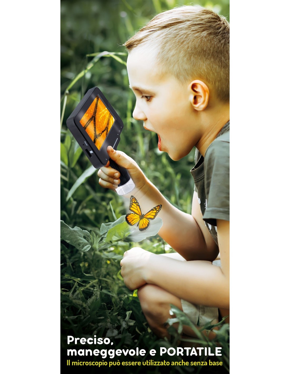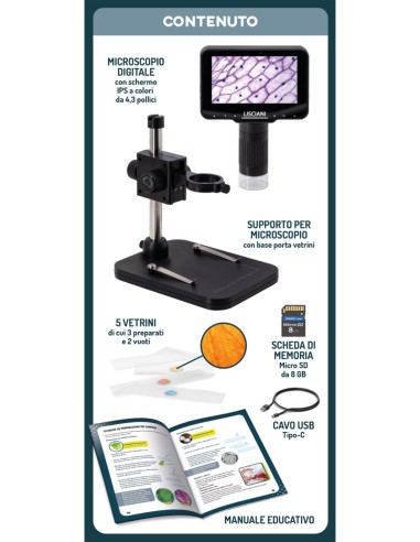 La confezione include una scheda Micro SD da 8 GB, che consente di salvare e condividere con facilità foto e video delle proprie scoperte. Collegandolo al PC tramite cavo USB, e utilizzando il software dedicato, è possibile analizzare le immagini in modo ancora più approfondito, rendendo l’esperienza educativa e completa.
