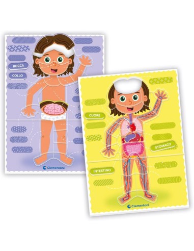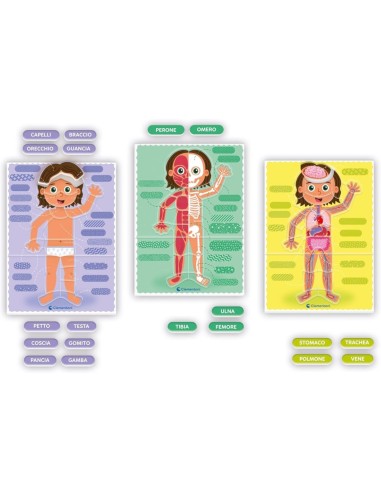 All’interno della confezione, i piccoli scienziati troveranno cartellini con i nomi delle parti del corpo, schede illustrate, un grande schema anatomico e una sagoma da ricomporre per imparare a riconoscere ossa, organi e muscoli.
