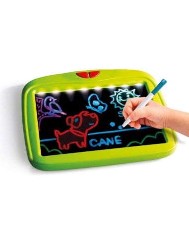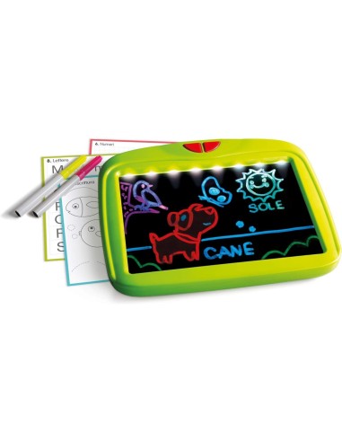 - Lavagna LED luminosa con piano trasparente e pennarelli fluorescenti per disegnare e scrivere.