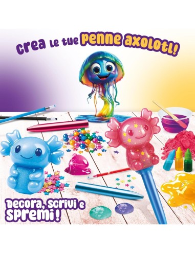 All’interno della confezione sono presenti alcune penne (solitamente più di una), materiali per creare la parte squish/slime (compresi inserti morbidi o liquidi da inserire), elementi decorativi (come glitter, perline mini, sticker) e istruzioni per guidare il bambino passo dopo passo nella personalizzazione. Il risultato è una penna che non solo scrive, ma offre anche una parte interattiva morbida al tatto, rendendo il momento scuola o disegno più ludico.